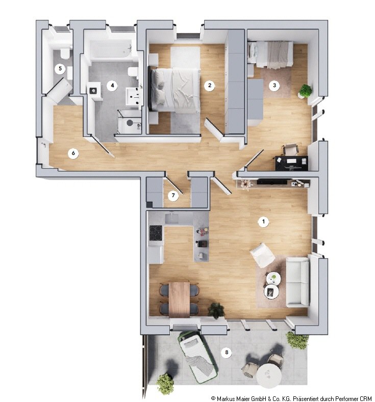 4. Holzparkett- oder Vinylboden nach Wahl in allen Wohn-, Ess- und Schlafräumen. Leicht zu pflegen und schön anzusehen.