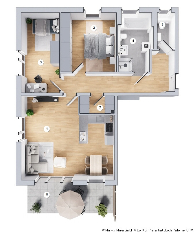 4. Holzparkett- oder Vinylboden nach Wahl in allen Wohn-, Ess- und Schlafräumen. Leicht zu pflegen und schön anzusehen.
