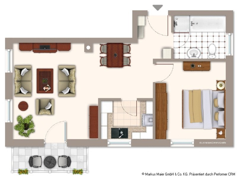 Die Wohnung verfügt über ein Bad mit Fenster, Küche mit Einbauküche (ohne Herd und Kühlschrank), Schlafzimmer und einen großen Wohn- und Essbereich mit Zugang zum Balkon.