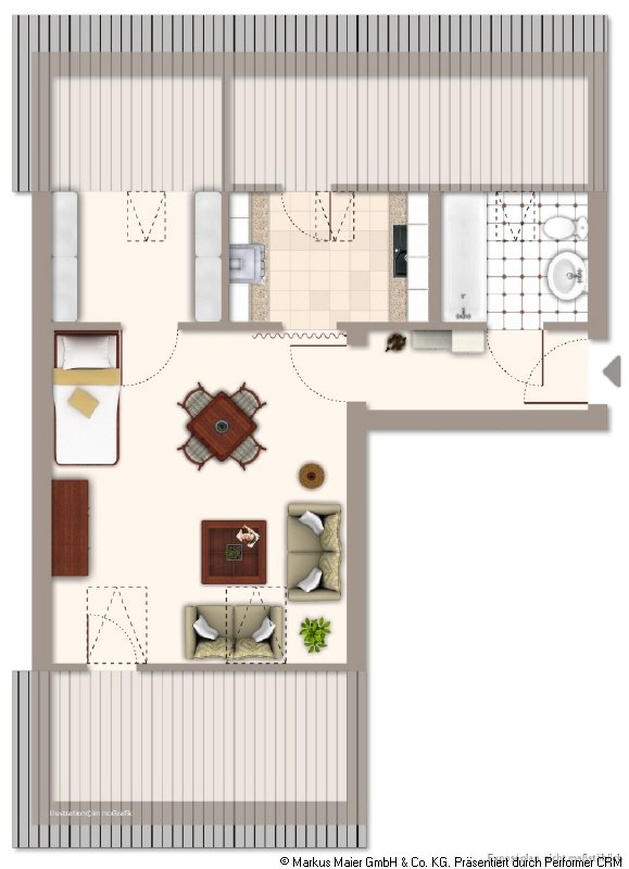 Die Wohnung befindet sich im DG einer kleinen Wohnanlage.Vom Flur aus hat man Zugang zum Wohnzimmer, Bad und Küche. Im Bad mit Fenster befindet sich eine Badewanne und auch der Waschmaschinenanschluss.
